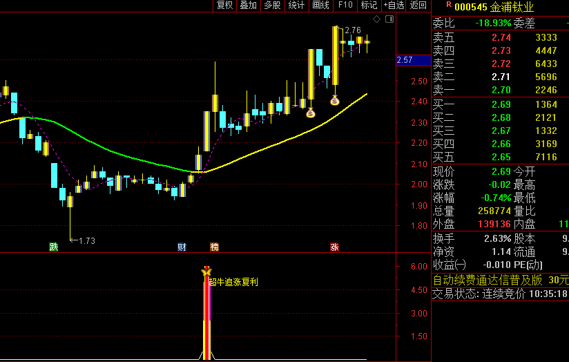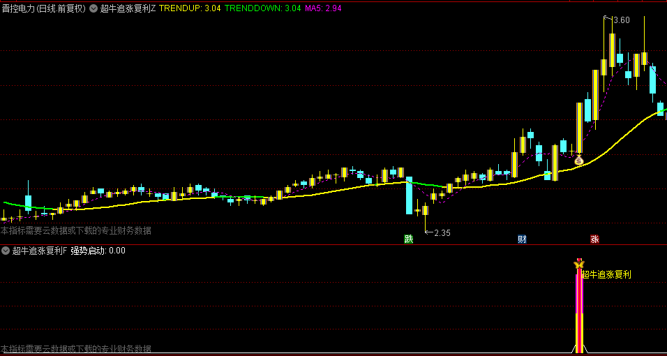 通达信【超牛追涨复利】主图/副图指标,趋势轨道翻黄+三色柱出现时建仓