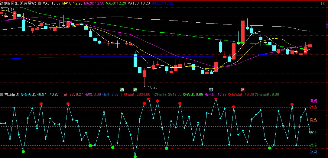 此指标能直接显示市场涨停家数,跌停家数,通过最终显示的过冷过热来反应抄底次日的成功率,打板的晋级率。