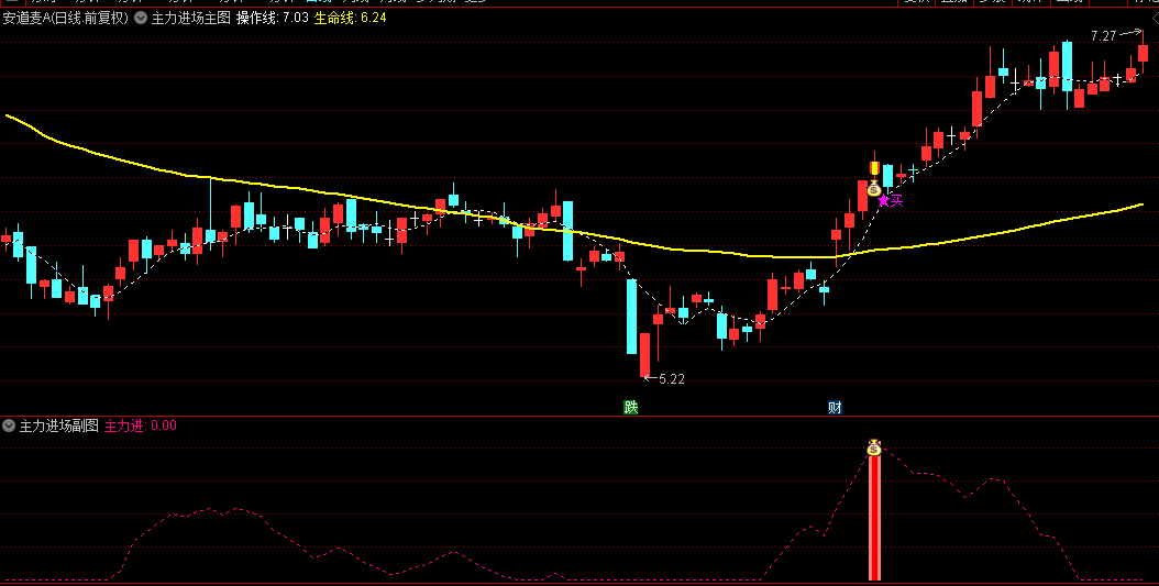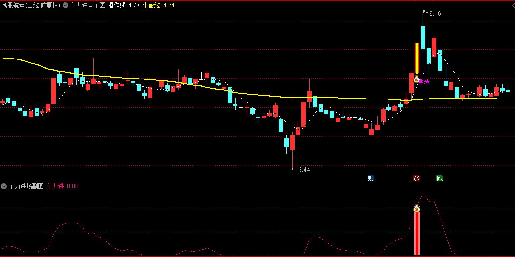 线的颜色和形态:主力进场主图指标有2条线,分别代表操作线(白色)、生命线(黄色线)两线代表的资金趋势的变化情况。