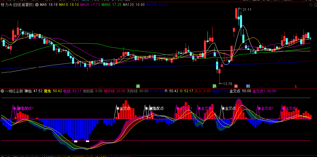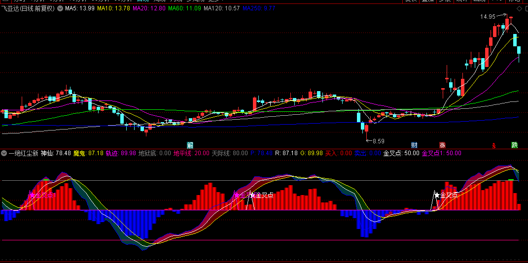 在主图形成白色楔形三角向上即可考虑买入,但有时候在主图白色楔形三角向上不太明显,今配上最隹副图,且使选股器更具有一定的把握,喜欢的股友可以一试,此副图称【一绝红尘新】,在一绝红尘副图公式基础上加以优化,添上金叉点,及金叉点1,配合MA死叉S选股器,当金叉点,及金叉点1,占上神仙红色柱时,即时买入点,特别是起始红柱子更好!今天用MA死叉S选股器选出的附上供参考。