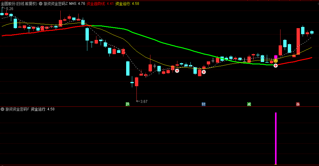 "钱袋子"紫色柱状图:当趋势线上穿资金线时触发,是确认主力资金进场的重要信号。
