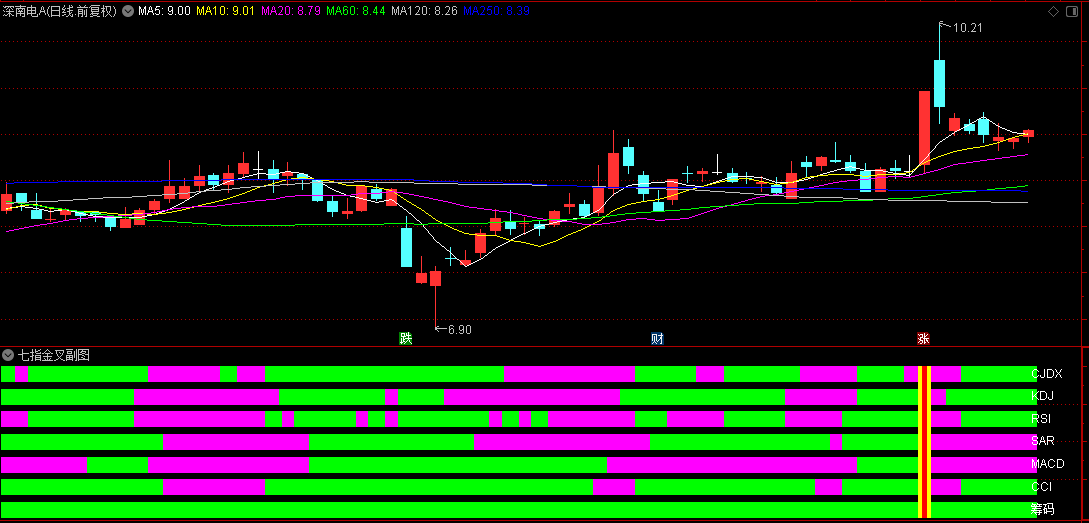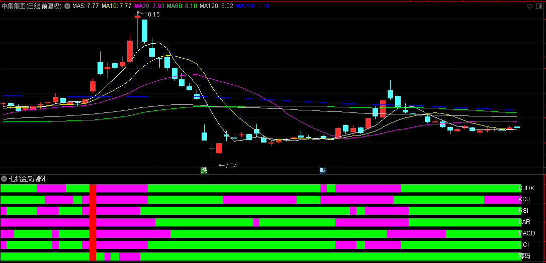 1.副图指标:用于观察个股是否符合"七指金叉"条件,当出现红色信号柱时考虑介入。