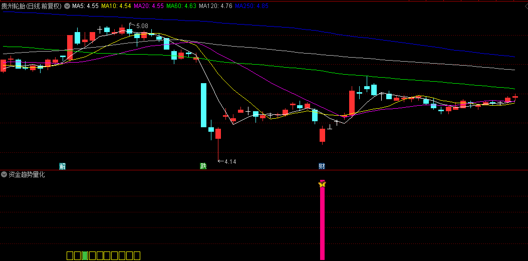 【资金趋势量化】副图指标,当单柱出现文字趋势量化,可关注或潜伏!