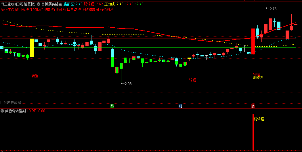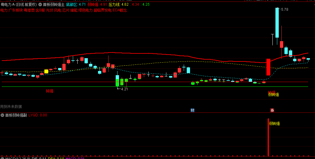 3.可视化标记:使用不同颜色的柱状图标记关键价位突破,在K线图上直接标注"转强"、"弱转强"等文字提示。