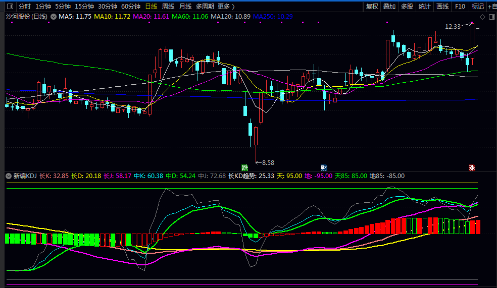 4、技巧: 当长J值在高位(>50)或低位(< -50)区域持续运行时,应尊重长周期趋势方向(长K>长D或长K<长D),利用中周期信号进行波段操作,避免轻易逆势操作。