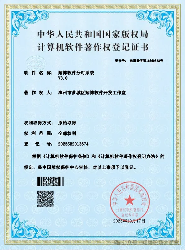 PS#:漳州市芗城区翔博软件开发工作室研发的“翔博软件分时系统V3.0”。该软件已获得中华人民共和国国家版权局颁发的计算机软件著作权登记证书(登记号:2025SR2013674),其原创性与权属获得国家权威认证。