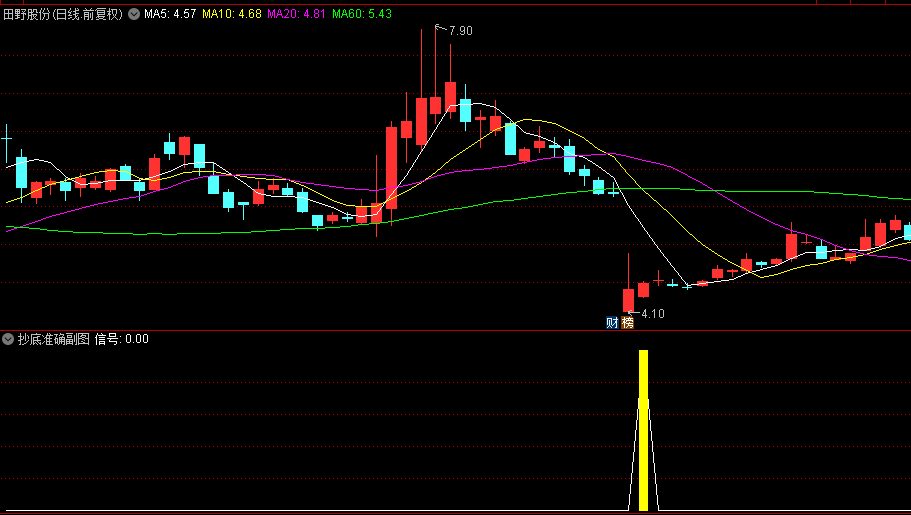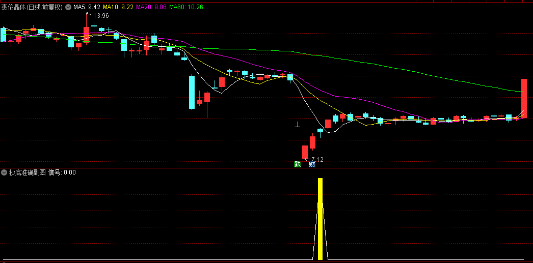 指标用于暴跌好的抄底,指标出现就是底,指标会在最低价格的前后一天出现如果是阴线出的指标可以转天买入,如果是阳线出的信号当天就可以买入。
