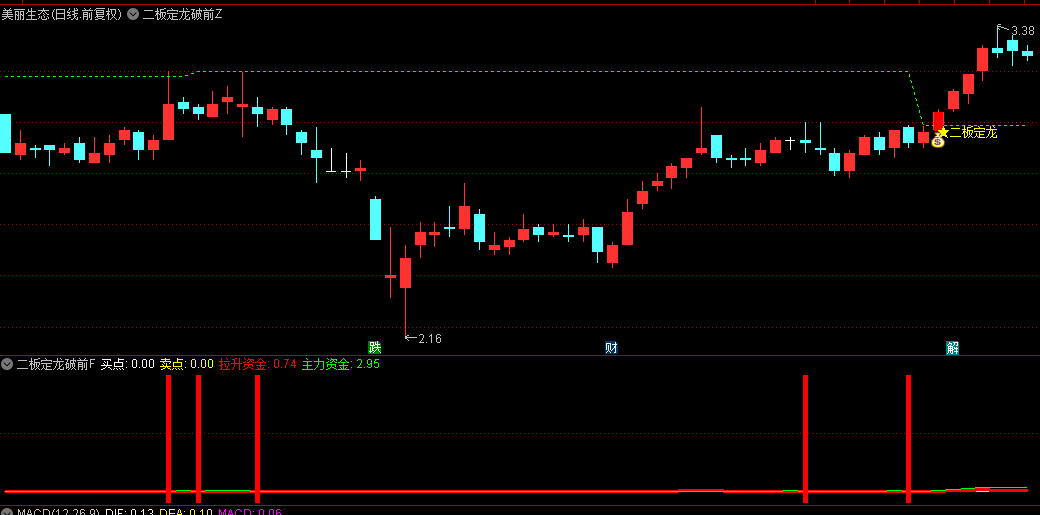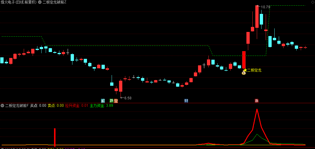 1.主图指标:绿色虚线标记"龙头成立"关键价位线,红色K线柱标记突破信号,黄色五角星提示"二板定龙"买点,独创"颈线突破"算法,自动识别有效突破。