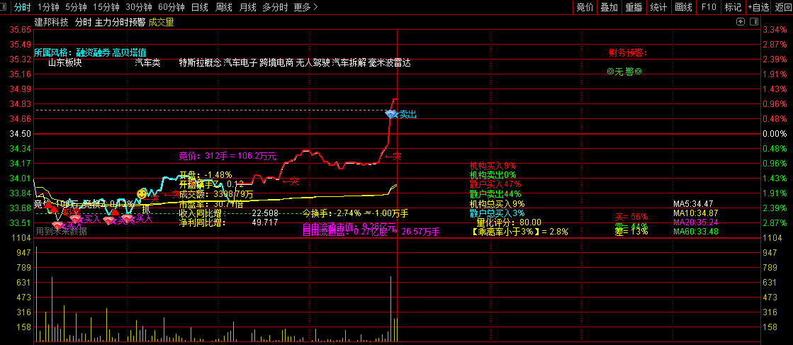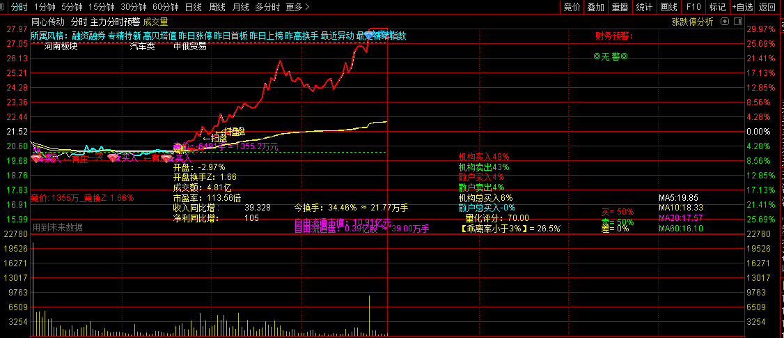 2.分时图中买入信号是主力单笔介入量比较大的点,突破信号是突破当天高点实现量价齐突的共振,扫盘信号是主力连续吃掉挂单筹码的扫盘口的信号。