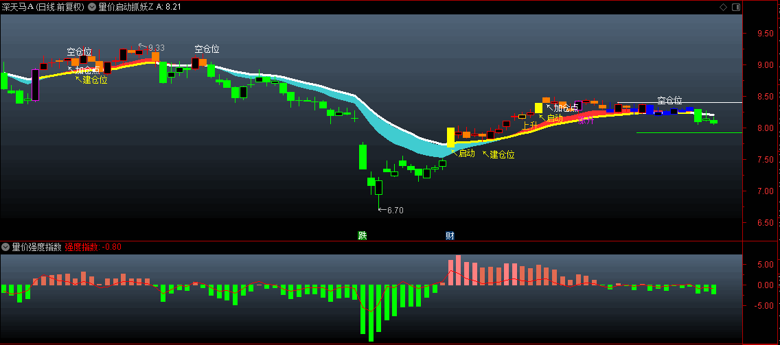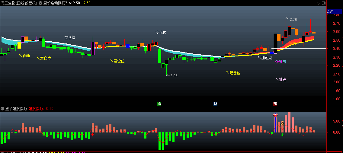 【量价启动抓妖】主图+【量价强度指数】副图指标,主图侧重趋势定位,副图专注能量监测,形成三维立体分析框架