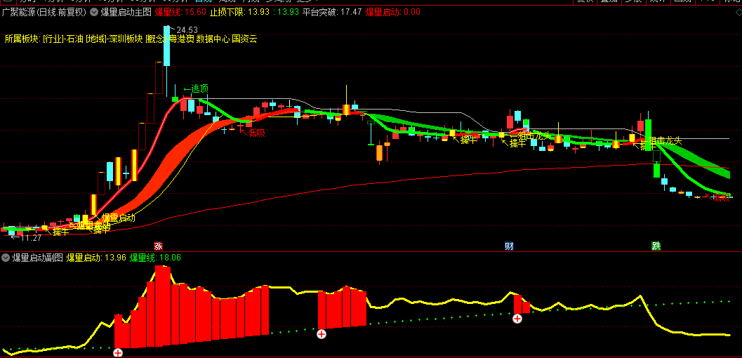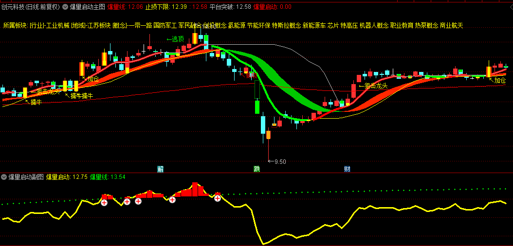 智能均线体系:融合20日加权均线与5日平滑曲线,通过红绿带宽动态展示多空分界。