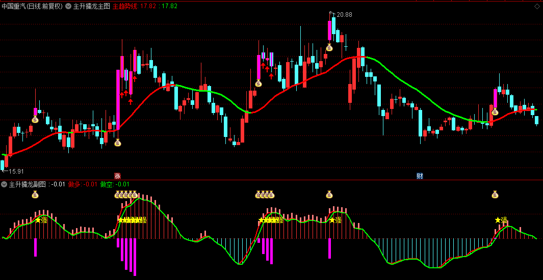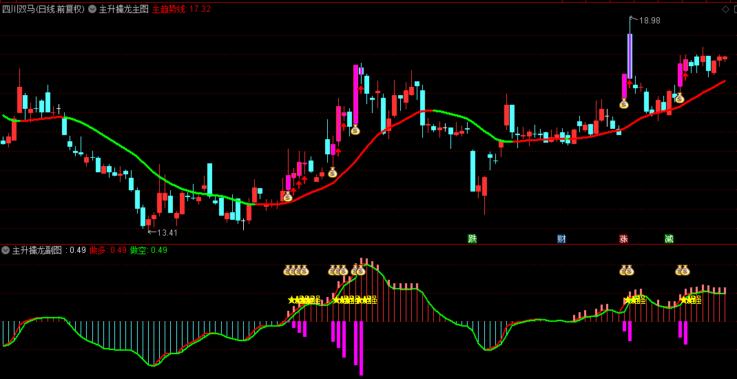 1.主图趋势研判模块:采用红色主趋势线直观展示多头行情;绿色趋势线清晰标识空头走势。