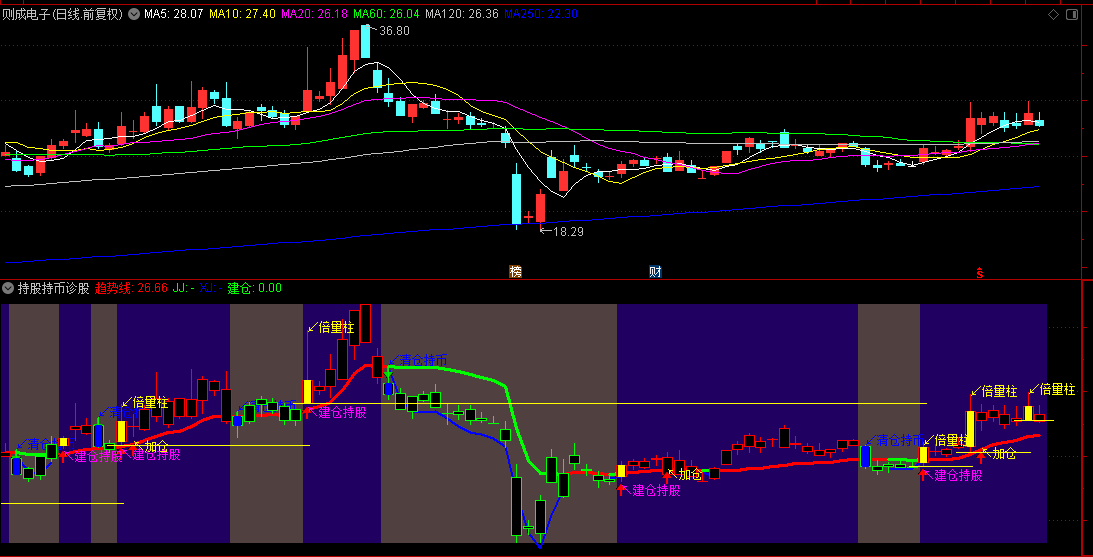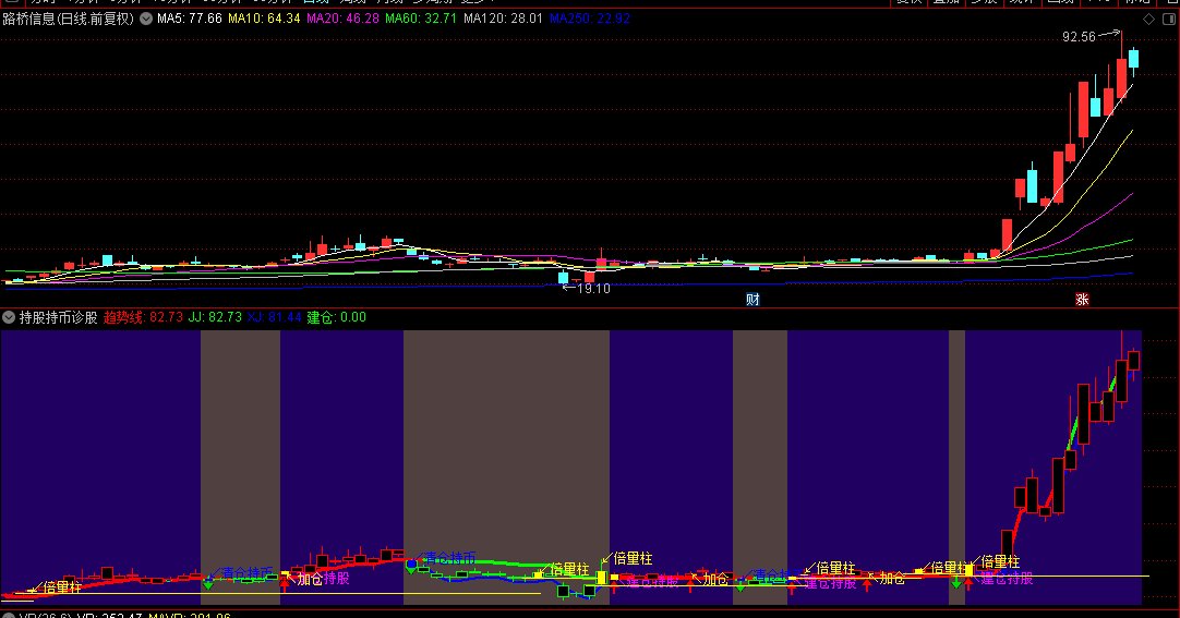 通达信【持股持币诊股神器】副图指标,出现建仓信号且伴随倍量柱时,预示较强上涨动能