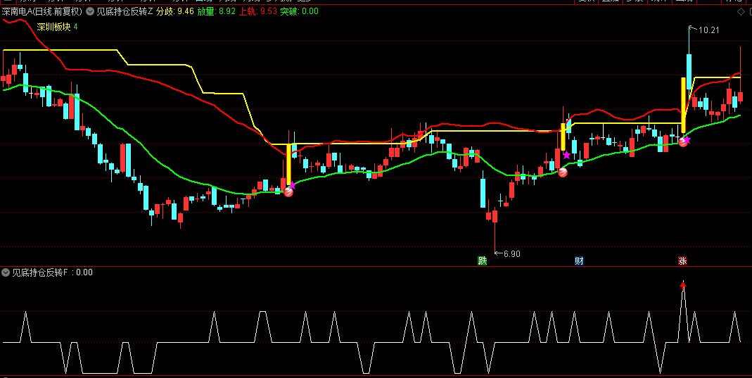 当股价同时突破分歧线和布林上轨,且量比大于1.8时,显示紫色五角星标记"★";