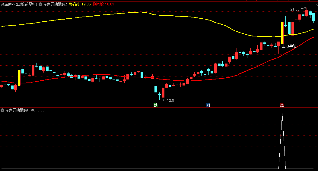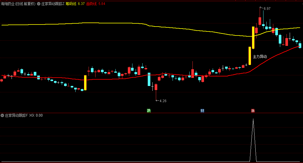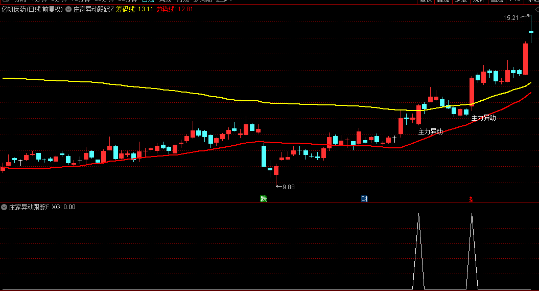 2.选股条件:当收盘价由下向上穿越筹码线时,触发"主力异动"买入信号。