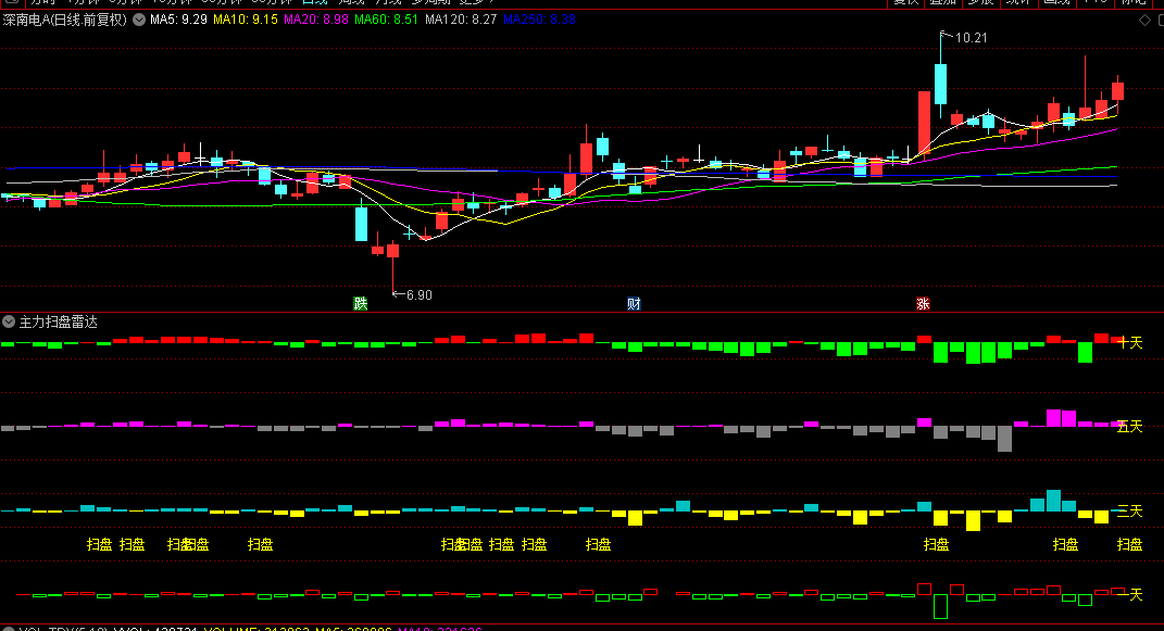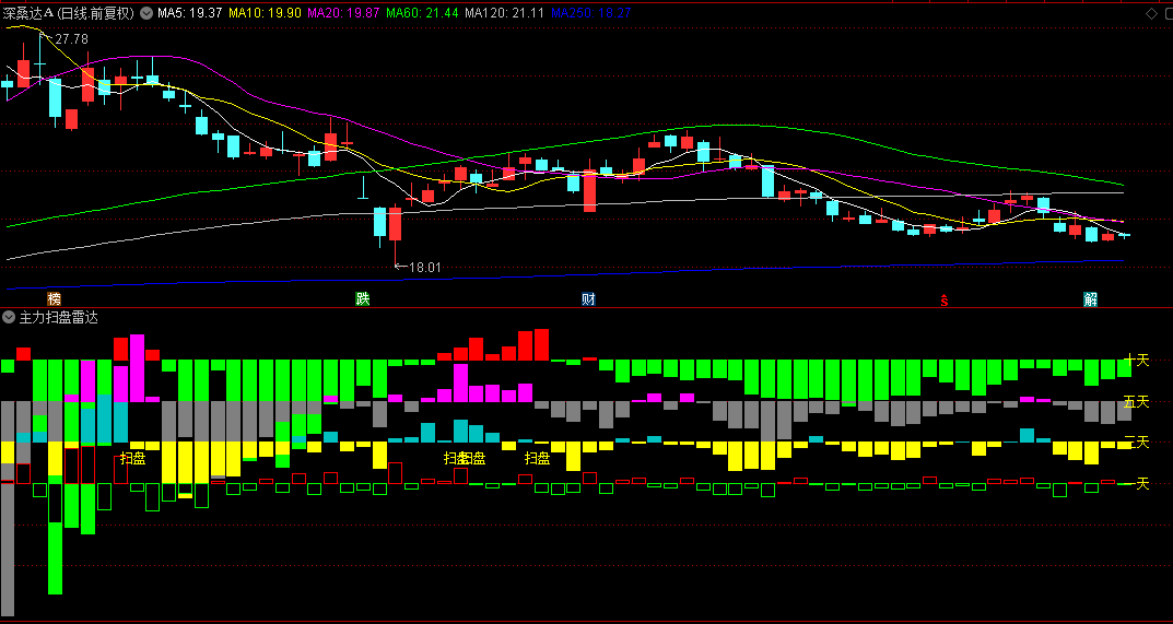 3. 五日动态(洋红/灰柱):中线资金风向标,识别主力持续运作痕迹。