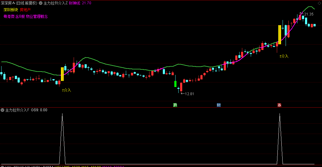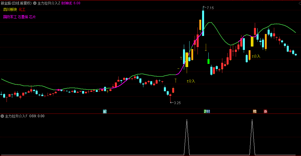 ①强势介入信号(黄色K线):开盘低于财神线但收盘强势突破,当日涨幅>7%,自动标注"↑介入"箭头提示。