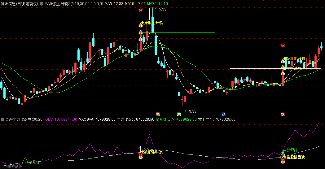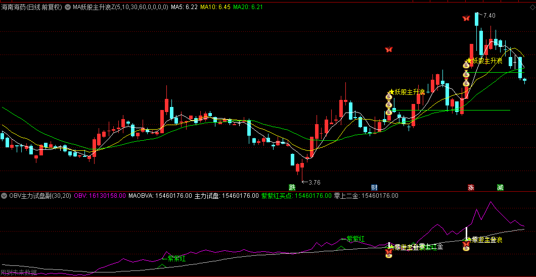 这里将试盘K线和妖股主升浪选股指标叠加到OBV副度指标中,