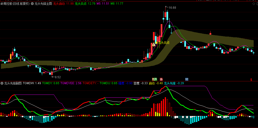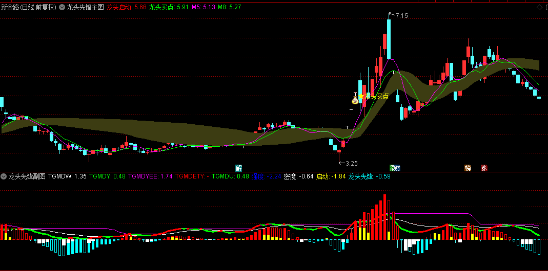 当红色粗线持续高于绿色粗线,且龙头先锋黄色柱体放大时,主升浪概率大。