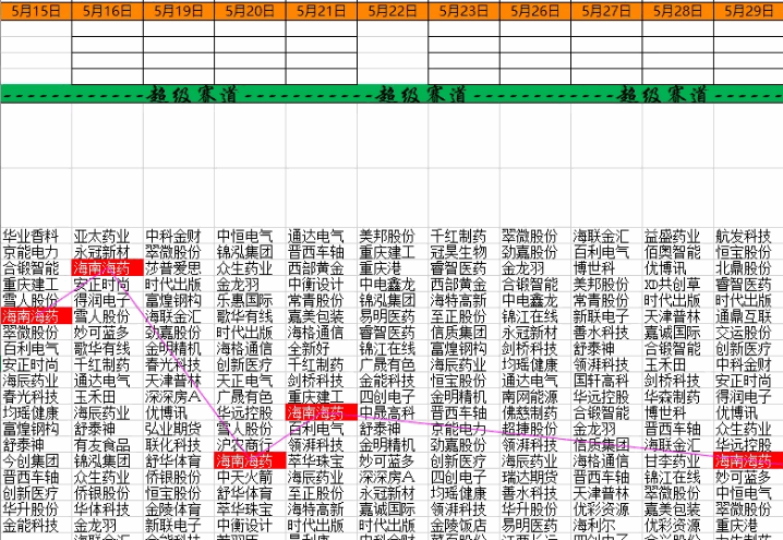 说明:这个表格是我采用大周期结合日线周期,增加牛妖基因和大资金动作来圈定的个股,然后,利用电子表格的宏功能,实现排名和发生次数以及发生的强度来制作完成的。