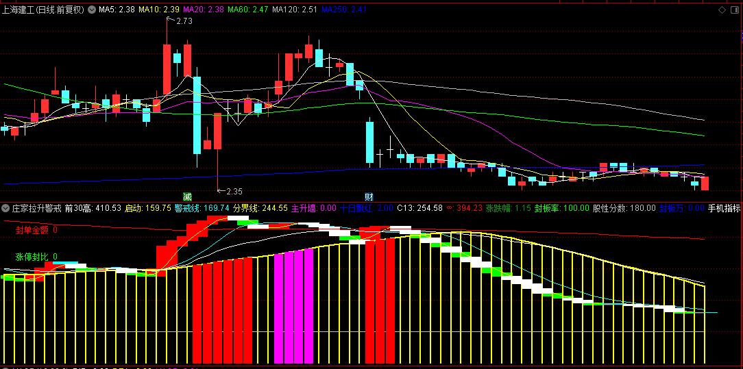 集成改良OBV能量潮指标,当突破150日峰值时触发"主升墙"紫色波段信号。