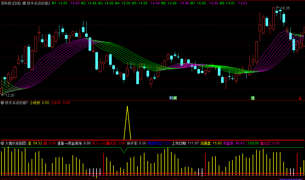【多维牛股突破】主图/副图/选股指标,突破牛熊线+牛股突破信号,给出明确买入提示主图指标功能1.多维度均线系统:计算3条核心均线:30日最高价均线(多维1)、13日均线(多维2)、21日指数均线(多维3),通过不同颜色K线直观显示股价与各均...
